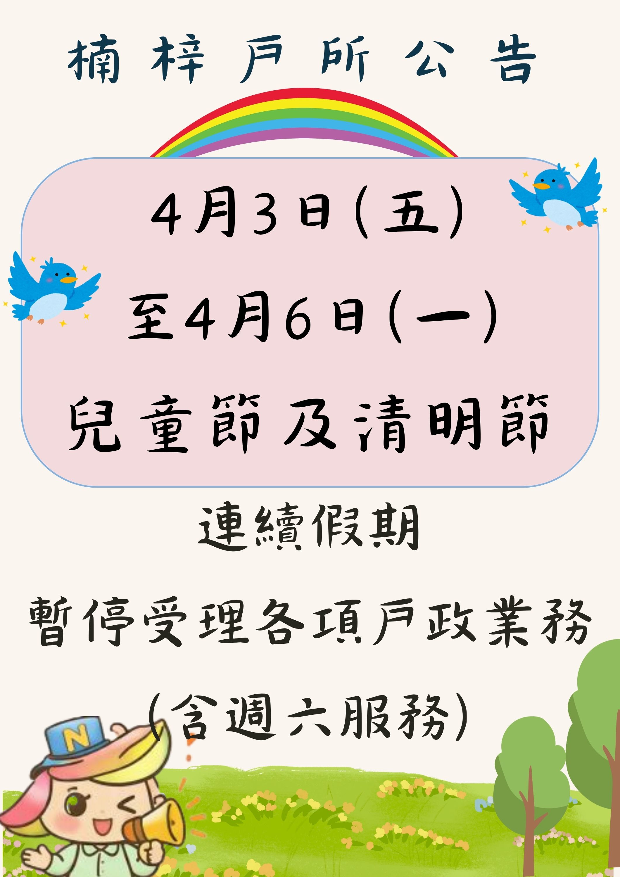 115年4月3日(五)至4月6日(一)兒童節及清明節連續假期,暫停受理各項戶政業務(含周六服務)